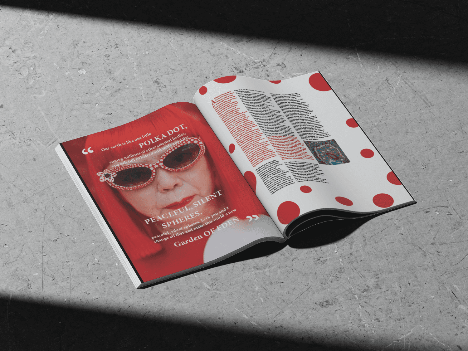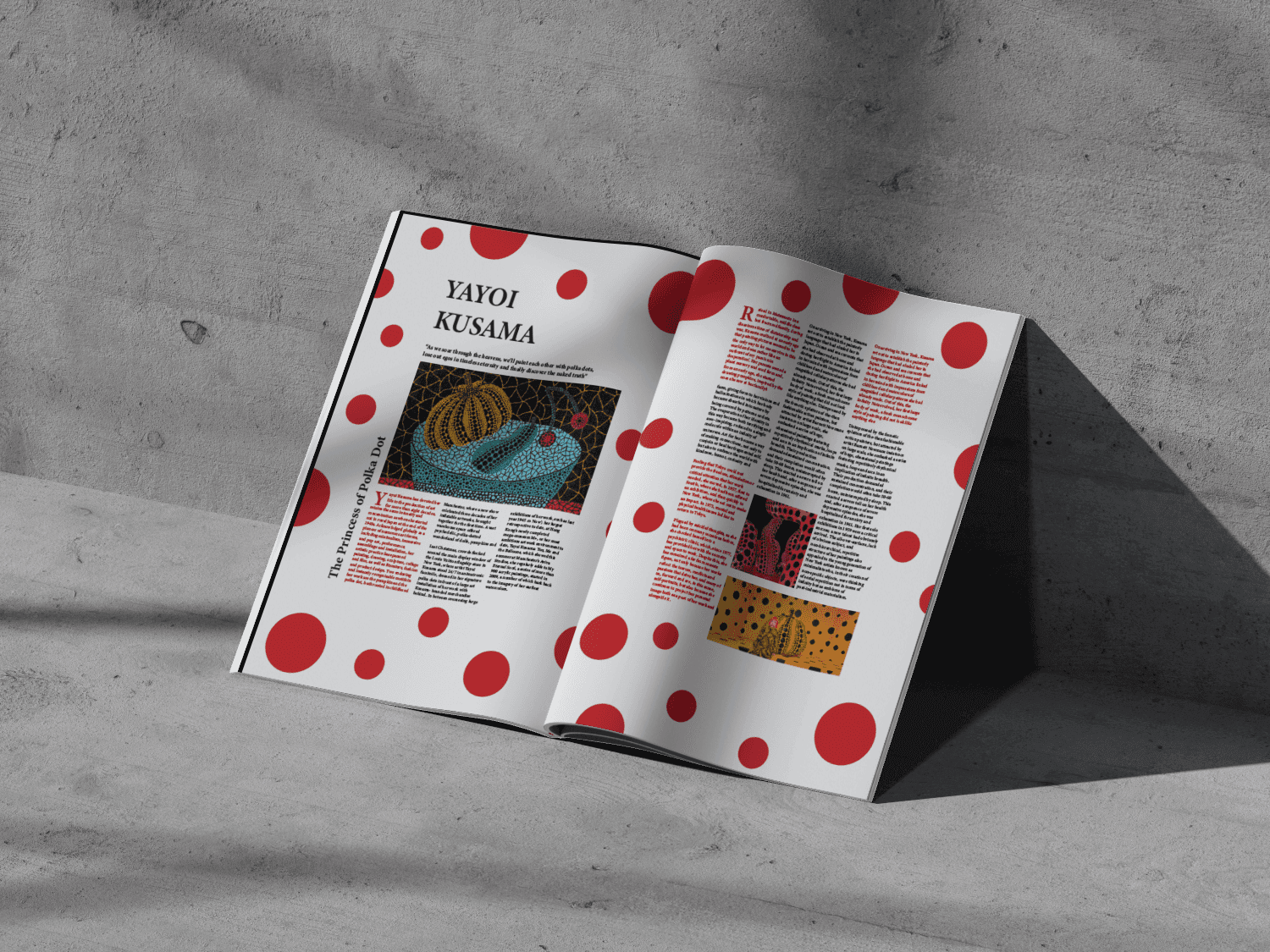 Through this magazine, I aim to delve into her artistic journey, explore the meaning behind her polka dots and infinite patterns, and pay homage to her relentless pursuit of self-expression.